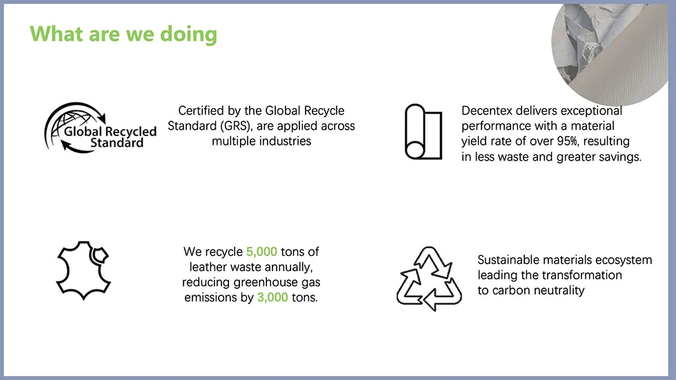 ความมุ่งมั่นของเราเพื่อความยั่งยืน: เบี่ยงเบนหนังหลายพันตันจากการฝังกลบและลดการปล่อยคาร์บอนโดยหลายพันตัน เราไม่เพียง แต่ปรับของเสียให้เป็นสิ่งที่มีค่า แต่ยังทำด้วยกระบวนการที่ช่วยประหยัดพลังงานและน้ำในปริมาณมหาศาลในขณะเดียวกันก็ลดการปล่อย CO2
