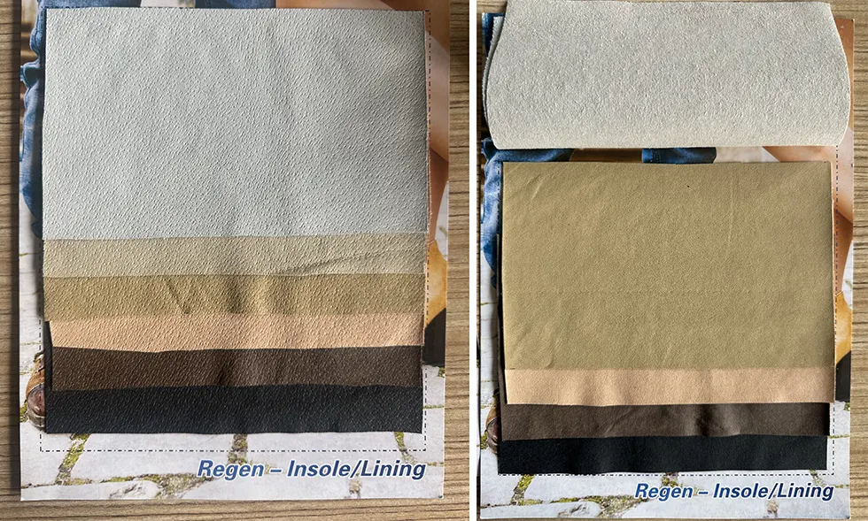 รูปลักษณ์และพื้นผิว: รองเท้ารีไซเคิลซับหนังมีพื้นผิวที่เรียบและพื้นผิวที่ดี มันสามารถเลียนแบบพื้นผิวของหนังชนิดธรรมชาติต่าง ๆ เช่น cowhide, หนังแกะ, หมู ฯลฯ ผ่านการแปรรูป